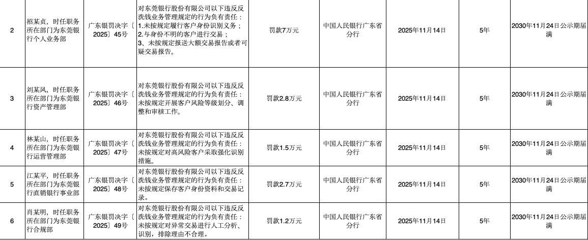 同时,中国人民银行广东省分行对东莞银行5名相关部门责任人分别处罚1.2万元~7万元不等,合计处罚金额15.2万元。