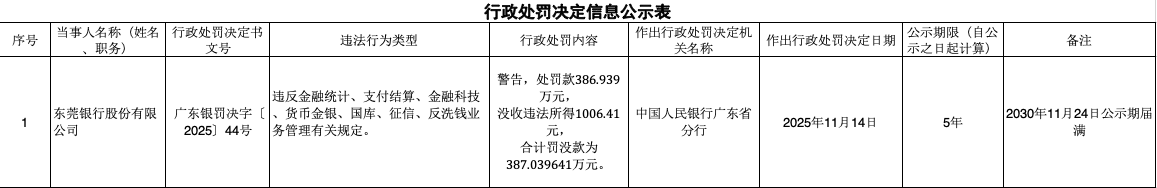 11月25日,中国人民银行广东省分行行政处罚决定信息公示表显示,东莞银行股份有限公司因违反金融统计、支付结算、金融科技、货币金银、国库、征信、反洗钱业务管理有关规定,被警告,处罚款386.939万元,没收违法所得1006.41元,合计罚没款为387.039641万元。