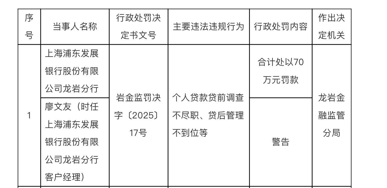 罚单显示,上海浦东发展银行股份有限公司龙岩分行的主要违法违规事实为:个人贷款贷前调查不尽职、贷后管理不到位等。