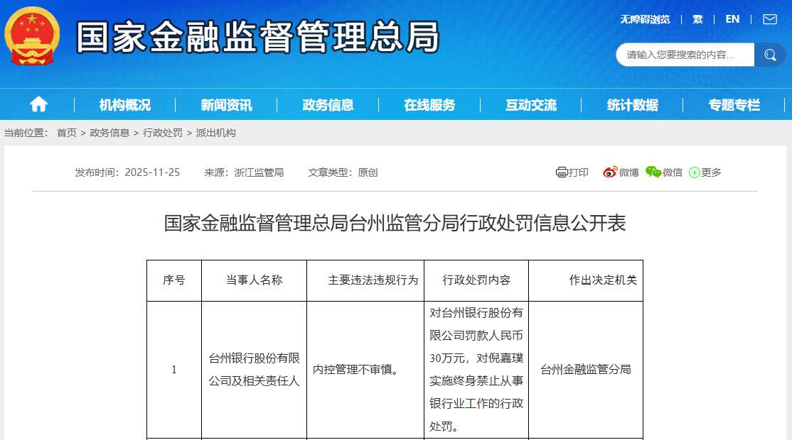 国家金融监督管理总局台州监管分局11月25日披露行政处罚信息公开表,剑指台州银行股份有限公司及相关责任人。