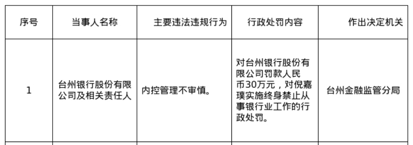 罚单显示,台州银行股份有限公司的主要违法违规事实(案由)为:内控管理不审慎。