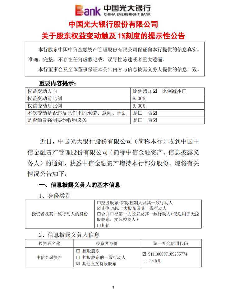 7月23日,光大银行曾发布公告表示,该行近日收到中信金融资产的通知,中信金融资产于2025年1月20日至2025年7月22日期间,增持该行A股股份约2.64亿股,H股股份约2.79亿股,合计占该行总股本的0.92%,中信金融资产持股比例由7.08%增加至8%,触及1%的整数倍。