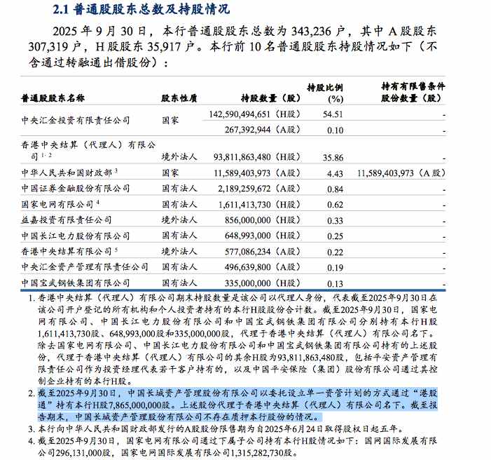 建行三季报显示,截至2025年9月30日,长城资产以委托设立单一资管计划的方式通过“港股通”持有该行H股7,865,000,000股。上述股份代理于香港中央结算(代理人)有限公司名下。截至9月末,长城资产管不存在质押该行股份的情况。