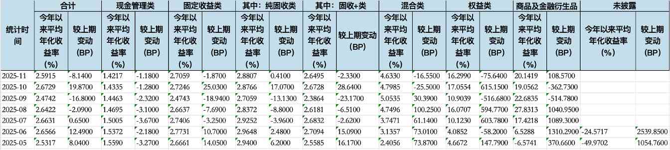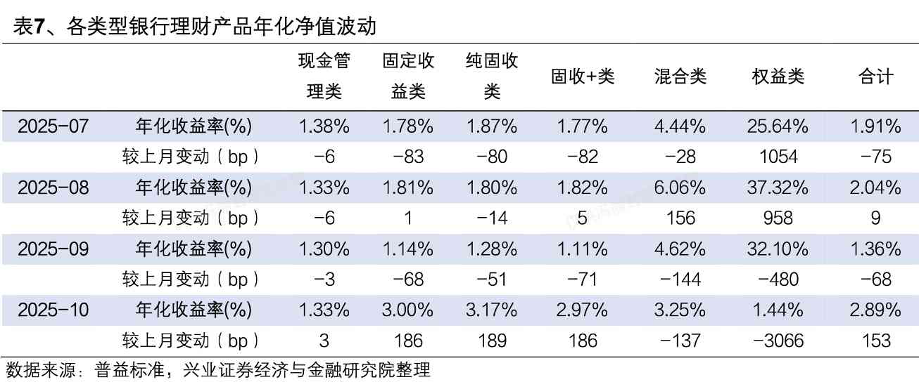 根据普益标准数据,2025年10月,现金管理类理财产品近1月年化收益率为1.33%,较上月增长3bp;固定收益类理财产品收益率为3.00%,较上月上升186bp,其中纯固收类、固收+类理财产品收益率分别为3.17%、2.97%,分别较上月增长189bp、186bp;混合类理财产品收益率为3.25%,较上月下降137bp。
