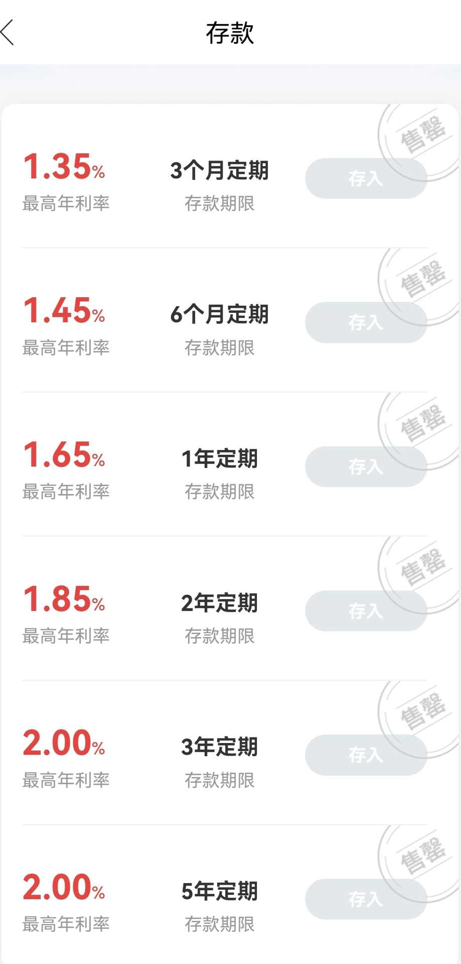 第一财经在蓝海银行APP上看到,该行3个月、6个月、1年期、2年期、3年期、5年期定期存款均显示为售罄。