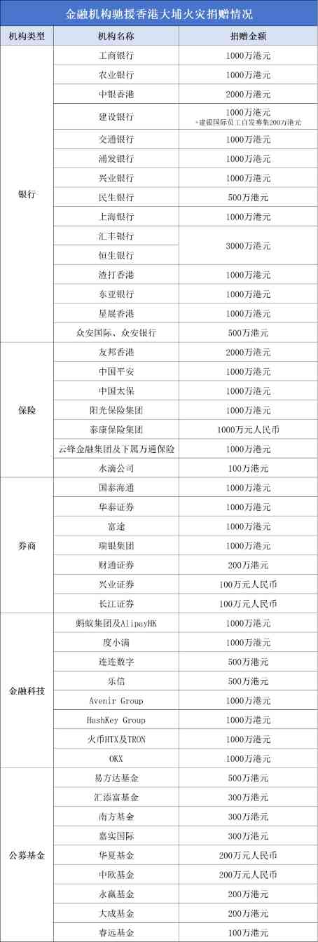 一方有难,八方支援。事故发生后,金融业迅速启动应急服务机制,全力支持救灾工作。据《国际金融报》记者不完全统计,已有近50家金融机构伸出援手,涵盖银行、保险、券商、金融科技、公募基金、期货等领域,合计捐款总额超3.7亿港元。