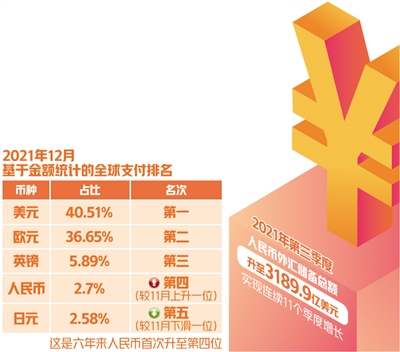 人民币全球地位再上新台阶。环球银行金融电信协会(SWIFT)近日发布的报告显示,2021年12月人民币国际支付份额由11月的2.14%升至2.70%,当月,人民币在国际支付中的份额占比升至第四。这也是2015年8月中国央行“汇改”以来,人民币国际支付全球排名首次超越日元。