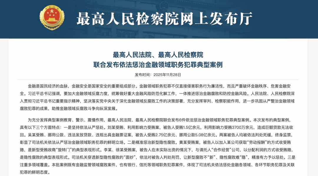 11月28日,最高人民法院、最高人民检察院联合发布6件依法惩治金融领域职务犯罪典型案例。其中提到,“黄某受贿案”中,被告人以加入某公司获取“劳动报酬”的方式收受贿赂,是新型受贿政商“旋转门”的典型表现形式。此次案例中提到,黄某被判有期徒刑14年,被处罚金400万元。
