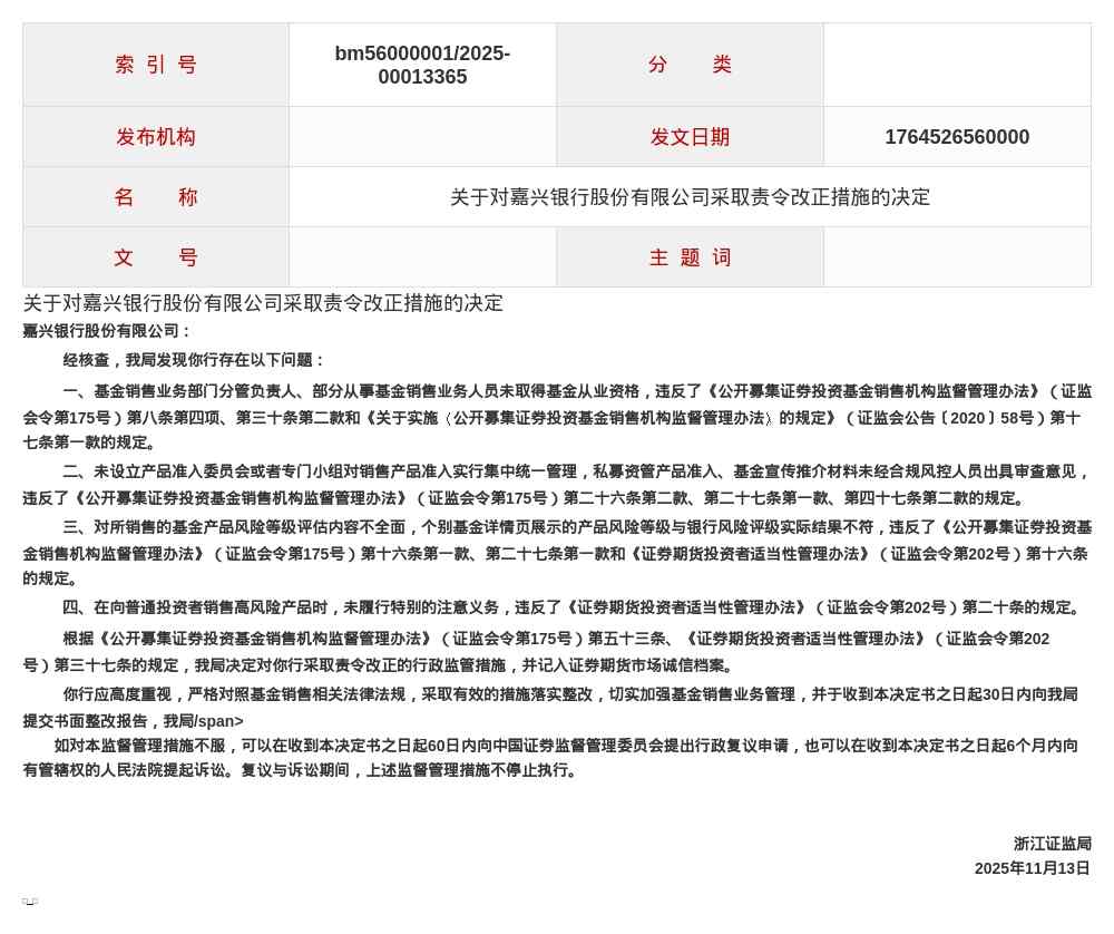 因此,浙江证监局决定对嘉兴银行采取责令改正的行政监管措施,并记入证券期货市场诚信档案。