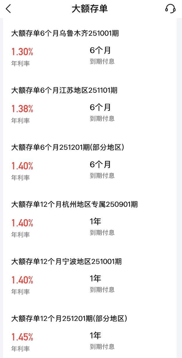 记者查询六大国有银行手机银行发现,五年期大额存单已集体“消失”。 在建设银行、农业银行、工商银行等银行的APP上,大额存单专区仅显示期限在1个月至3年期的产品,其中三年期大额存单利率约为1.55%,起购门槛多为20万元。交通银行的大额存单产品则仅显示1年期选项,年利率为1.4%,且对购买客户设置了地域限制。
