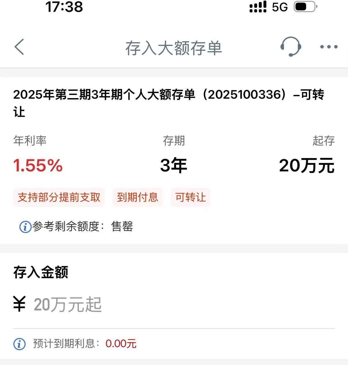 工商银行APP显示,该行正在发售的2025年第四期3年期高端个人大额存单,起步门槛标注为“100万起存”,年利率为1.55%。但与此同时,该行同步亦在发行3年期个人大额存单,起存金额为20万元。第一财经记者于12月3日下午17点38分查询发现,这两款产品均处于售罄状态。