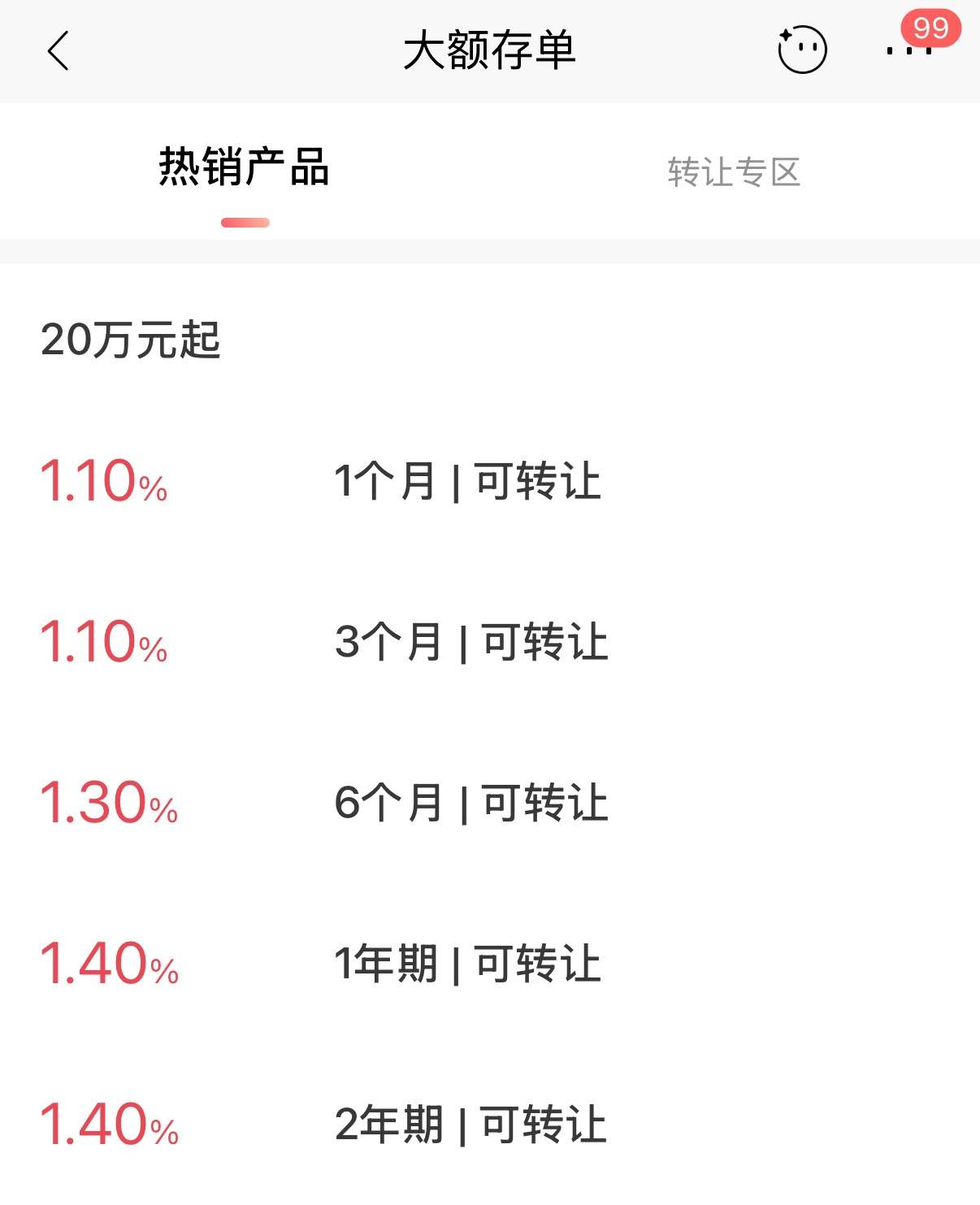 根据招商银行app显示,目前招商银行“大额存单”栏目下仅剩余1个月、3个月、6个月、1年、2年五个期限产品。其中,1年期、2年期大额存单产品利率均为1.4%。