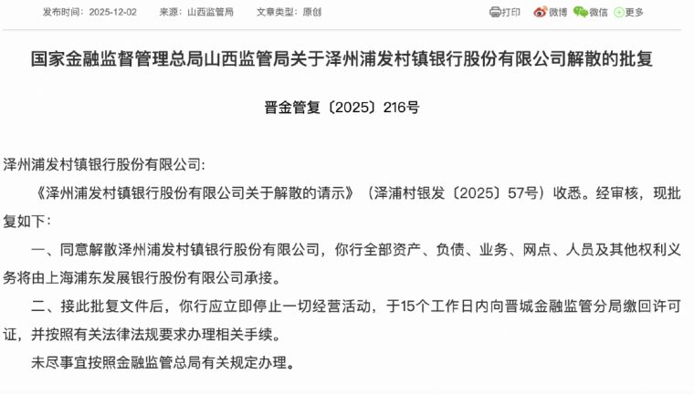 12月2日,国家金融监督管理总局山西监管局发布的《关于泽州浦发村镇银行股份有限公司解散的批复》显示,同意解散泽州浦发村镇银行,该行全部资产、负债、业务、网点、人员及其他权利义务将由上海浦东发展银行(简称“浦发银行”)承接。