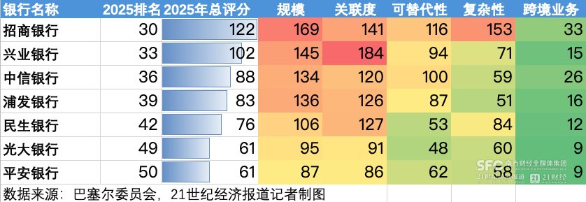 21世纪经济报道记者注意到,在被视为G-SIBs候选人的“第0组”中,招商银行已从去年的34名上升至30名,距离被认定为29家全球系统重要性银行仅有一步之遥;兴业银行(34名)、中信银行(37名)等股份行亦在集体逼近门槛。