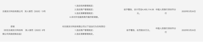 此前,3月24日,根据中国人民银行深圳市分行另一行政处罚决定,乐刷支付因违反机构管理规定、违反商户管理规定、违反清算管理规定,以及未对外包服务商开展尽职调查,被给予警告,并合计罚没445万元。