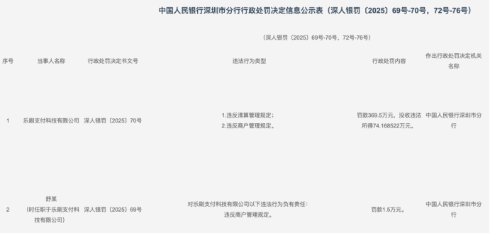 处罚信息显示,乐刷支付因违反清算管理规定和违反商户管理规定,被处以罚款369.5万元,并没收违法所得74.168522万元。同时,时任职于该公司的舒某对上述违反商户管理规定的行为负有责任,被处以1.5万元罚款。