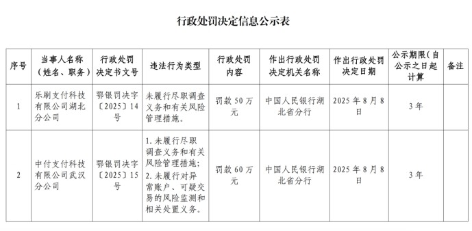 除此之外,今年8月8日,根据中国人民银行湖北省分行行政处罚决定,乐刷支付湖北分公司因未履行尽职调查义务和有关风险管理措施,被罚款50万元。