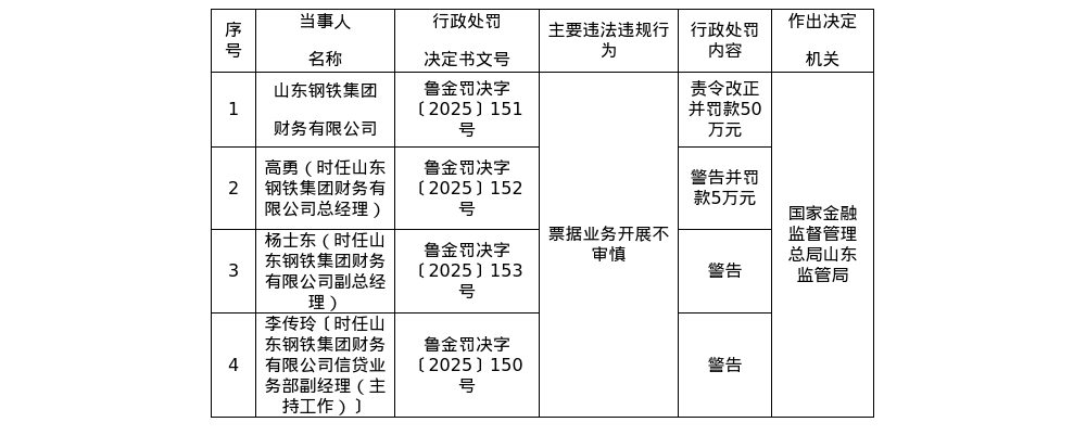 国家金融监督管理总局山东监管局发布了一张罚单,剑指山东钢铁集团财务有限公司及其相关责任人。