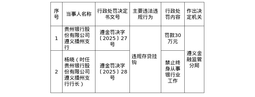 此外,时任贵州银行股份有限公司遵义播州支行行长杨晓,被禁止终身从事银行业工作。
