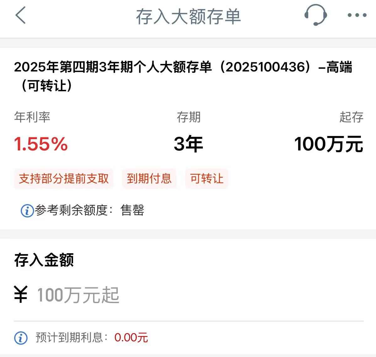 工商银行APP显示,该行正在发售的2025年第四期3年期高端个人大额存单,起步门槛标注为“100万起存”,年利率为1.55%。但与此同时,该行同步亦在发行3年期个人大额存单,起存金额为20万元。第一财经记者于12月3日下午17点38分查询发现,这两款产品均处于售罄状态。