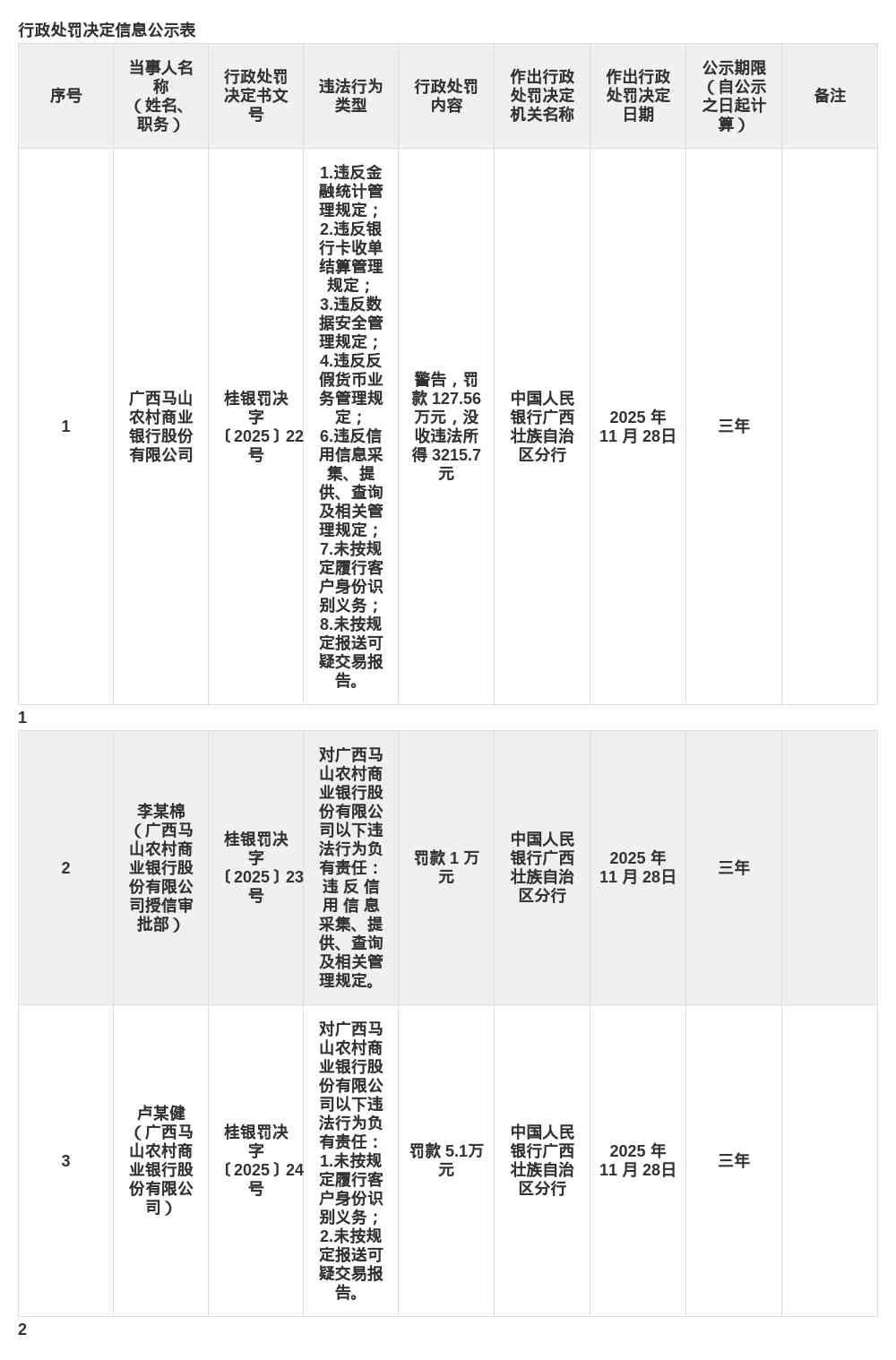 蓝鲸新闻12月3日讯,近日,中国人民银行广西壮族自治区分行公布行政处罚决定,剑指广西马山农村商业银行股份有限公司及其相关责任人。