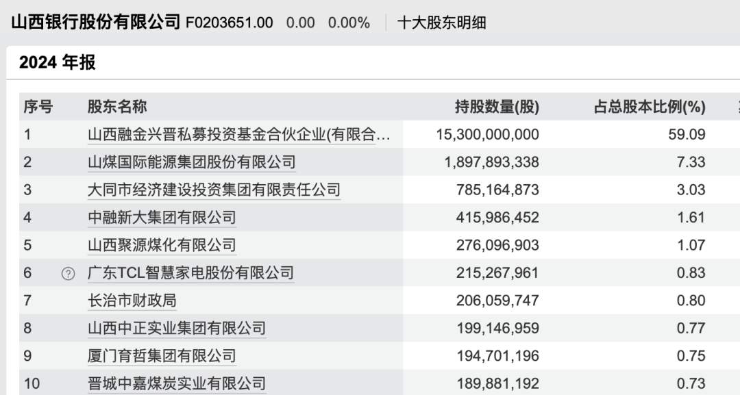 Wind数据显示,山西银行第一大股东为山西融金兴晋私募投资基金,持股比例为59.09%;山煤国际能源集团、大同市经济建设投资集团、中国新大集团、山西聚源煤化分别持股7.33%、3.03%、1.61%、1.07%。