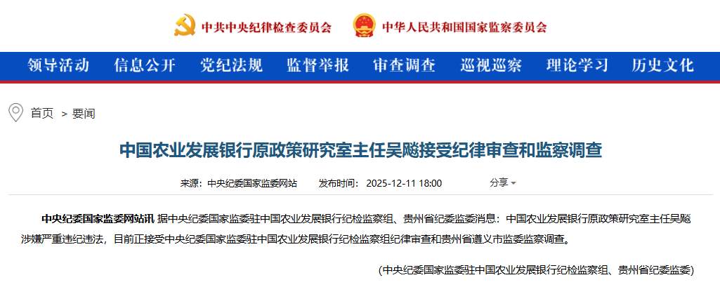 12月11日,据中央纪委国家监委驻中国农业发展银行纪检监察组、贵州省纪委监委消息:中国农业发展银行原政策研究室主任吴飚涉嫌严重违纪违法,目前正接受中央纪委国家监委驻中国农业发展银行纪检监察组纪律审查和贵州省遵义市监委监察调查。